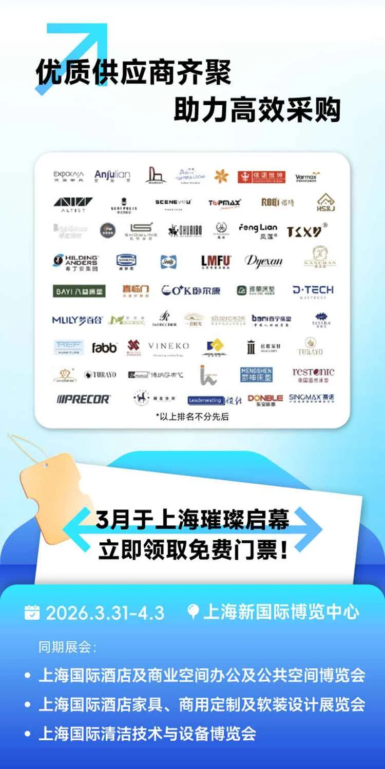 1. Consultez la page de l'exposition concernée ou le site web officiel du Salon du meuble de Shanghai. 2. Cliquez sur le bouton « Réservation de billets » ou « Soumettre une demande » pour accéder à la page de réservation. 3. Remplissez vos informations personnelles comme indiqué, y compris votre nom, votre numéro de téléphone et votre numéro d'identification. 4. Soumettez la demande après avoir confirmé que les informations sont correctes. 5. Après avoir reçu le message de confirmation, conservez les informations de confirmation provenant du SMS, de WeChat ou de l'e-mail.Le Salon international du mobilier hôtelier, de la personnalisation commerciale et du design d'ameublement de Shanghai présentera les produits suivants :