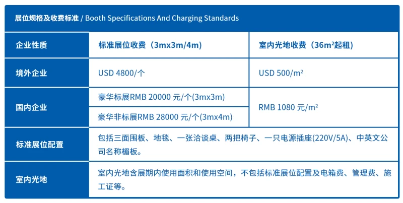 Remplissez le formulaire de demande : Remplissez le formulaire de demande de stand en ligne, en fournissant les informations de base sur l’entreprise et les exigences relatives au stand. Choisissez un stand : sélectionnez l’emplacement de votre stand préféré en fonction du plan d’aménagement, et confirmez le type et la taille du stand. Déposez votre candidature : Soumettez votre formulaire de demande d’emplacement et les documents connexes, et attendez que le comité d’organisation les examine. Signature du contrat : Une fois la demande approuvée, le comité d’organisation signera un contrat de location de stand avec l’entreprise candidate, précisant les droits et obligations des deux parties. Versement de l'acompte : Versez l'acompte pour l'emplacement, comme indiqué dans le contrat, afin de garantir la réservation de votre emplacement. Réglez le solde final : Réglez le solde final du stand selon les délais convenus dans le contrat. Confirmation de stand : Une fois le paiement effectué, la réservation du stand est officiellement confirmée et les exposants recevront une lettre de confirmation ainsi que les directives relatives à l'exposition. Cabine standard : Veuillez vous renseigner auprès du service client pour connaître les tarifs.